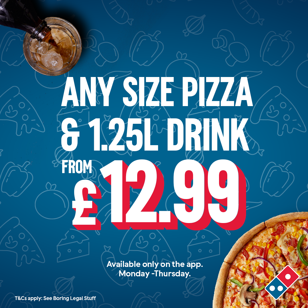 Known for our amazing pizza deals, Domino's has been serving delicious pizza in the UK since 1985. With pizza delivery & takeaway options available, we offer ultimate convenience. You'll find favourites like Cheese & Tomato & Pepperoni Passion, plus limited edition & local specialities specific to your store - all hand made to order using 100% mozzarella, vine-ripened tomatoes, and our signature fresh dough. Our vegetarian & gluten free pizzas offer something for everyone. Our sides & desserts menu is waiting to be explored too - chicken wings, loaded fries, our famous Domino's Cookies, & so much more. Our Lunch range offers light bites like Cheeky Little Pizzas plus Hot & Cheesy Wraps. Order now & satisfy those cravings!