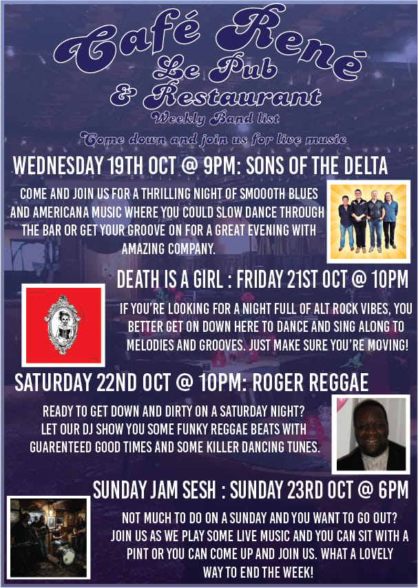 Visit award-winning Café René for traditional pub drinks, food and live music from bands and individual acts. Based in Gloucester, Gloucestershire, our bar restaurant is a place where you can eat drink and be merry in a relaxed friendly environment. Our food is something we are proud of. On Fridays and Saturdays nights we are open late and provide entertainment from 9 pm.